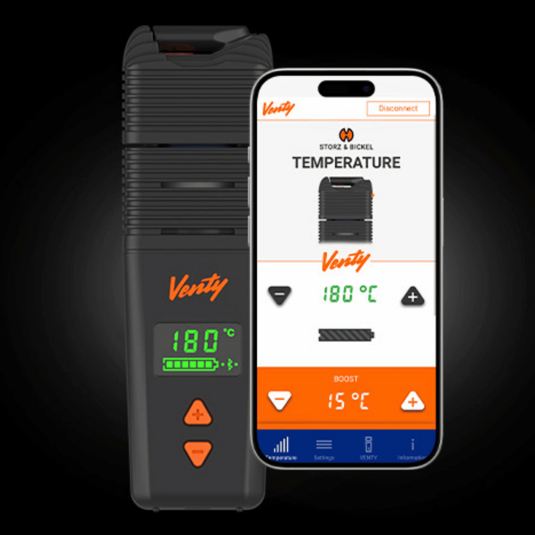 The Venty’s temperature range runs from 104°F to 410°F (40°C–210°C). You can adjust it in 1° increments using the device buttons or connect to the Storz & Bickel Web App for precise digital control. Boost (+15°C) and Superboost (+30°C) modes are also available for denser vapor.